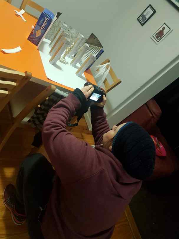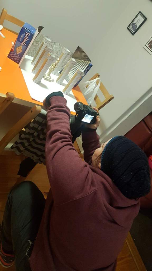 I could not find good pictures for my gods and goddesses so I decided to make a diorama and use the Greek alabaster statues that I have at home for the models. I stuck two toilet paper rolls on top on one another and then stuck a picture of a temple column on the front to create the temple columns. For the background, I used a picture of a temple wall with Greek writings on it, I copied this four times to make the area of the back wall. The sides are pictures of a wall of columns from a temple in Greece. All these pictures I got from free picture websites. For the floor, I used wet tea bags to soak the paper and give it an old stained stone look. During this process one of tea bags broke and tea fell over the paper, I decided it made it look more authentic as the tea looked like dirt on the floor, I went on and broke open a few more tea bags to create ‘dirt’ for the floor. I had a great time creating the scenes and I enjoyed the challenge.